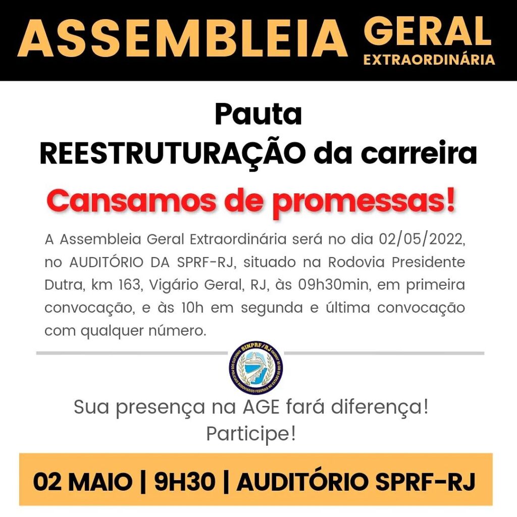O Presidente do Sindicato dos Policiais Rodoviários Federais no estado do Rio de Janeiro – SINPRF/RJ, no uso de suas atribuições estatutárias, convoca os filiados para Assembleia Geral Extraordinária a realizar-se no dia 02/05/2022, no AUDITÓRIO DA SPRF-RJ, situado na Rodovia Presidente Dutra, Km 163, Vigário Geral, RJ, às 09h30min, em primeira convocação, e às 10h em segunda e última convocação com qualquer número, a fim de tratar da seguinte pauta: 1) Reestruturação da carreira. José Roberto Gonçalves de Lima Neto – Presidente.
