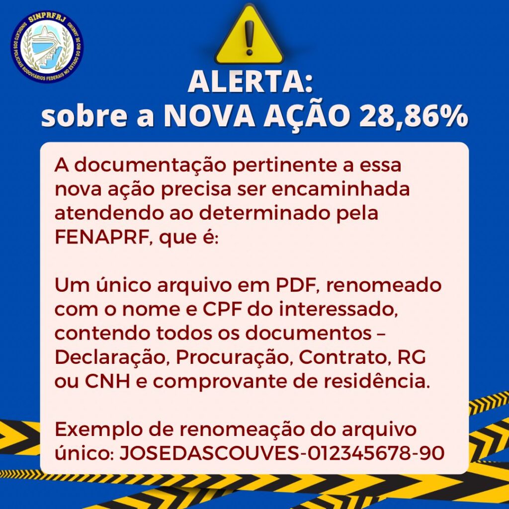 Uma nova ação dos 28,86% será protocolada, pela FENAPRF, e os interessados, que se enquadrem nas restrições acima, PRECISAM enviar os documentos abaixo em formato PDF, digitalizados em arquivo nomeado com seu nome e CPF, para sinprfrj@sinprfrj.org.br até o dia 28-02-2024.